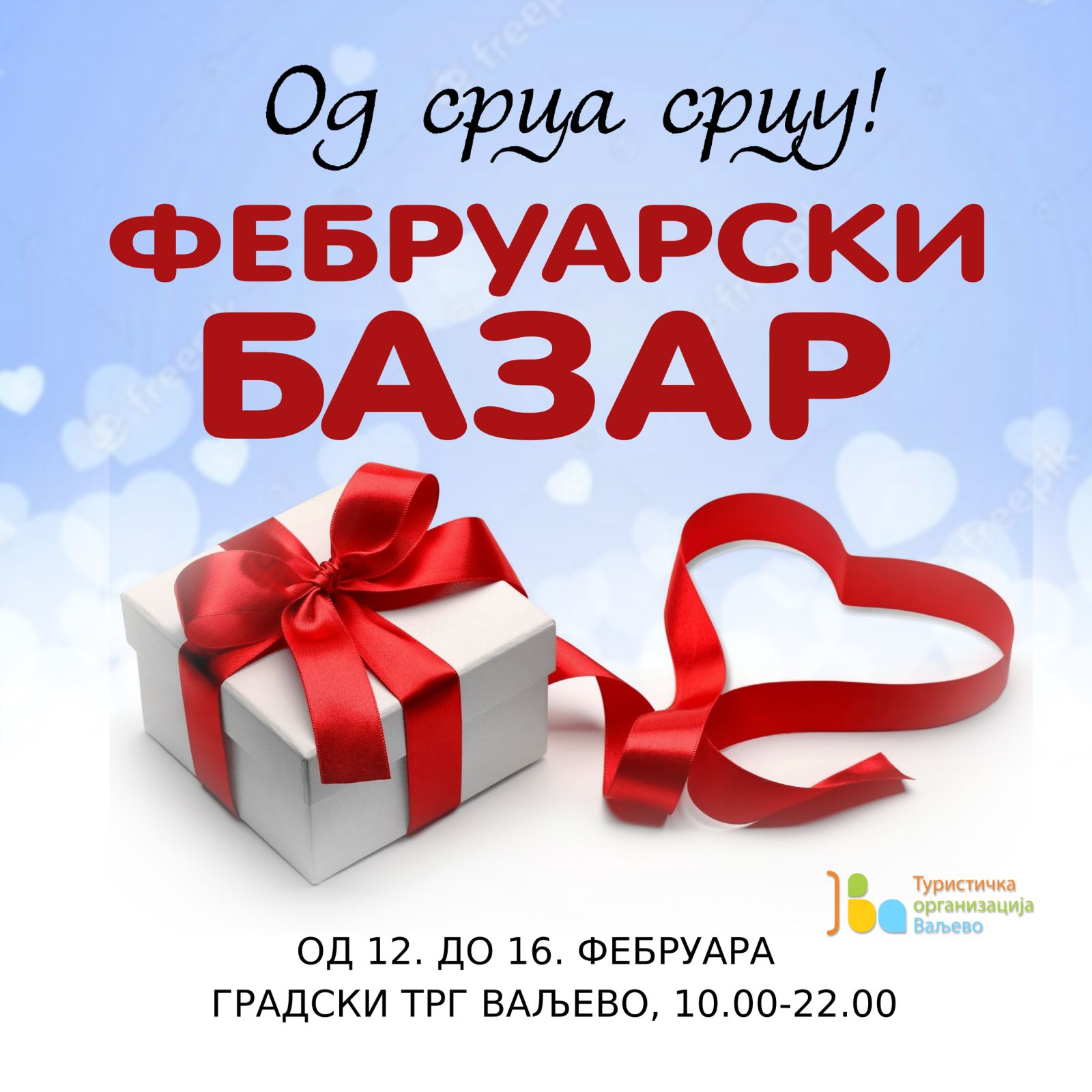 Turistička organizacija Valjevo, Grad Valjevo pozivaju sve zainteresovane pojedince, ustanove i udruženja, da kao izlagači, učestvuju na februarskom bazaru u u Valjevu , koji će se održati na Gradskom trgu u periodu od 12. februara do 16. februara 2022. godine. Radno vreme bazara od 10 do 22h.