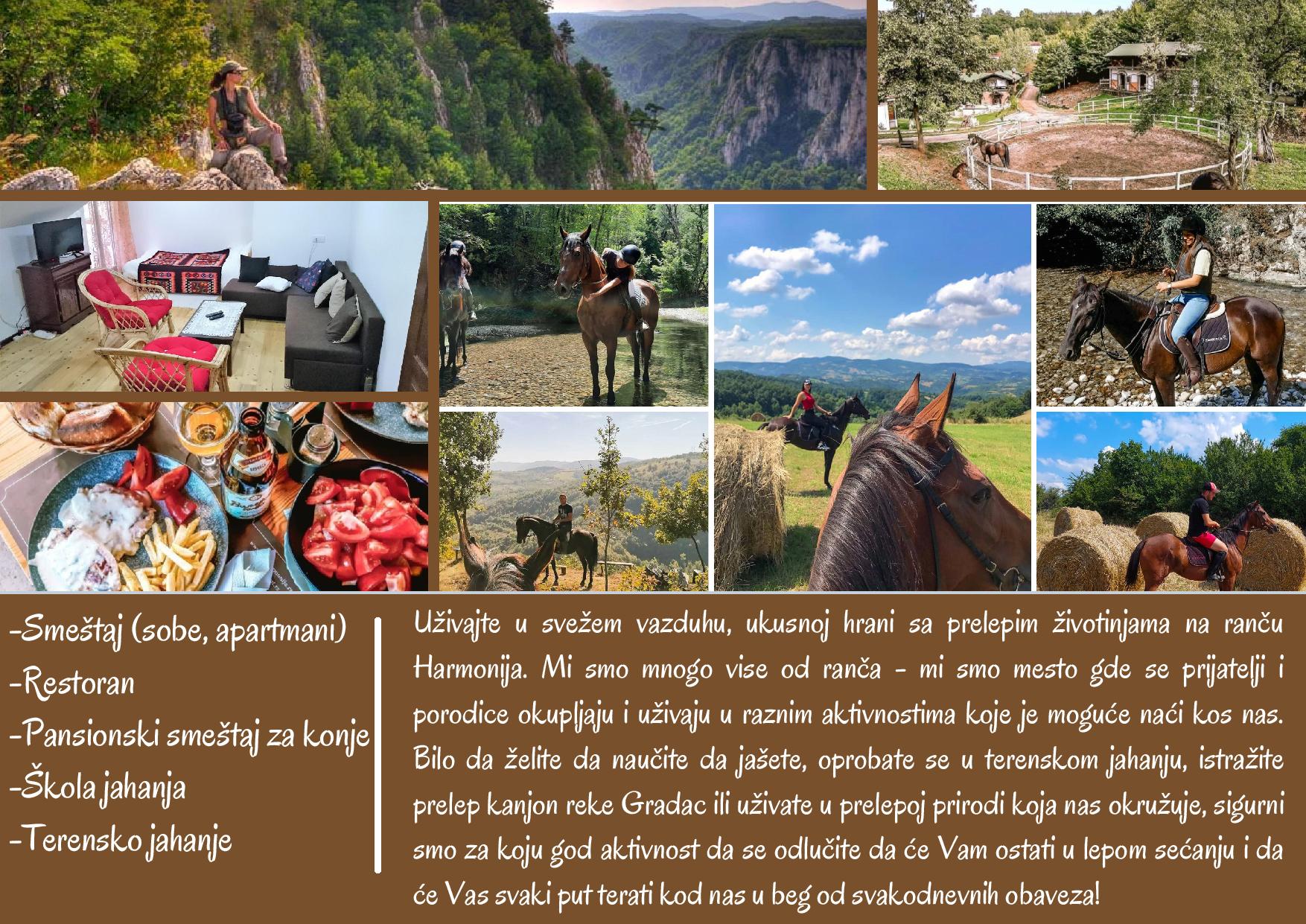 Ranč Harmonija je klub ljubitelja prirode,nadomak Valjeva,u kanjonu reke Gradac.Klub je nastao sa namerom pravilnog uzgoja i smeštaja konja.Unutar kluba Harmonija posluje i konjički klub Lastin put,čiji nas dosadašnji rezultati čine posebno ponosnim.
