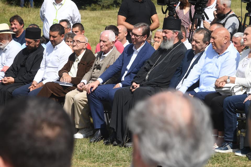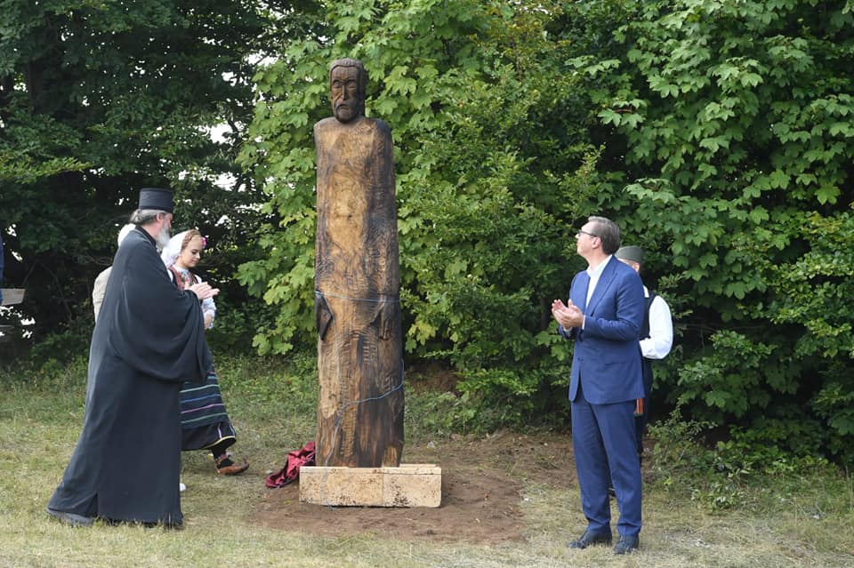 Predsednik Vučić, valjevski episkop Isihije i akademik Matija Bećković su otkrili skulpturu u liku Radovana Belog Markovića, izrađenu u hrastovom drvetu, koja je delo lajkovačkog vajara Milutina Rankovića.
